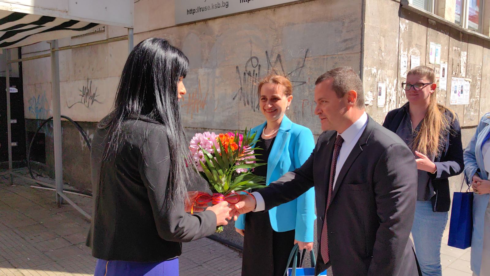 Гостите бяха посрещнати по стар български обичай с хляб и сол, а специален поздрав поднесоха шестокласнички от НУИ-Русе, които изсвириха на китара химна на Европа „Одата на радостта“.