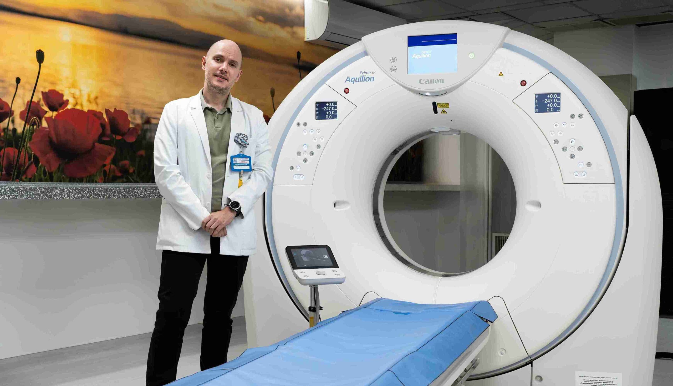 Процедурата беше реализирана с помощта на новия компютърен томограф Canon Aquilion Prime SP, оборудван с модул за КТ флуороскопия. Това е технология, която превръща скенера от диагностичен апарат в активен инструмент за интервенционални процедури.