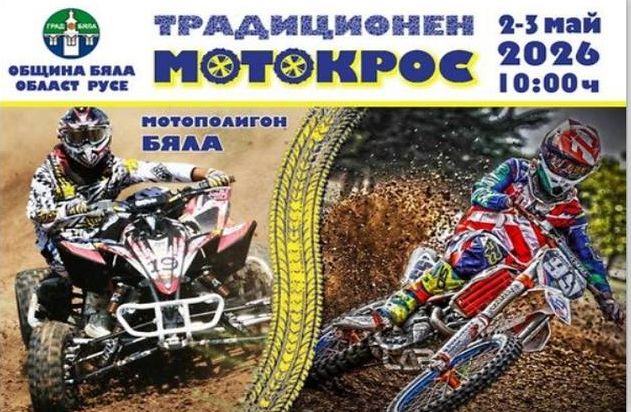 Мотокрос Бяла 2026 събира състезатели с мотори и АТВ-та на 2 и 3 май. Традиционното състезание се организира от Община Бяла в навечерието на Гергьовден на мотополигона в местността Сюлейманов ялак. – https://maps.app.goo.gl/cRBJ43G2buamn6cZ6