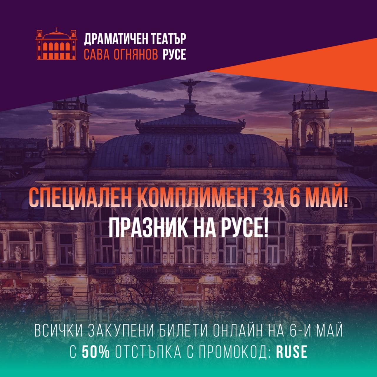 Само на 6 май и само при онлайн покупка на билети, зрителите ще могат да се възползват от 50% отстъпка за спектаклите от майската програма на театъра. Намалението ще бъде активно само 24 часа с промокод: RUSE. По този начин благодарим на своята вярна публика и каним повече хора да споделят магията на живото изкуство в празничния месец.
